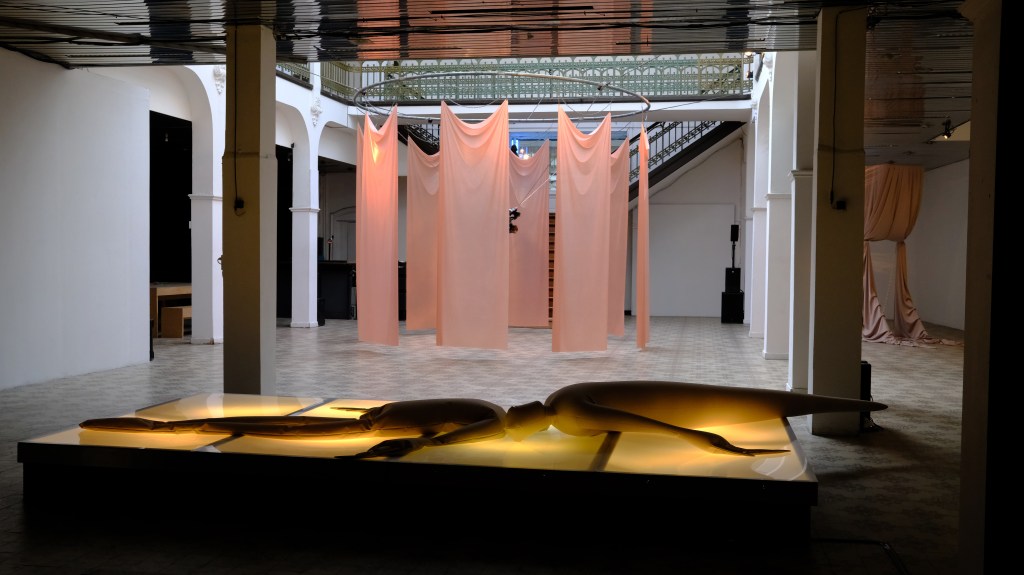Costumes et parures émaillées deviennent autant d’enveloppes à revêtir pour s’enliser dans la masse gélatineuse, la graisse de cire qui permet de communiquer, en sonar.