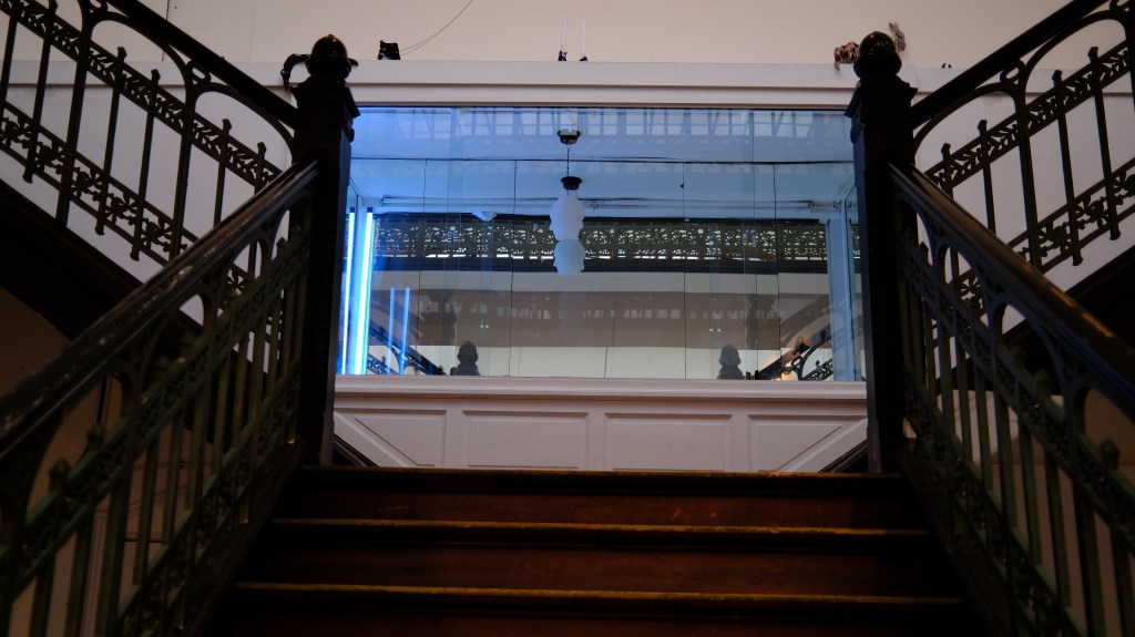 Au loin, l’être sirénien fait son entrée dans le cirque. Il se vêt de tentacules, enfile ses ailerons et tournoie, comme les autres, dans une cage en verre flotté.